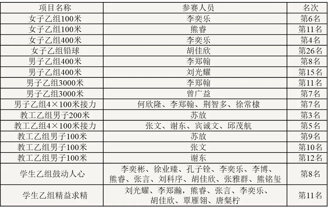 太阳成集团tyc7111cc师生在本次运动会中取得的成绩如下(排名不分先后):