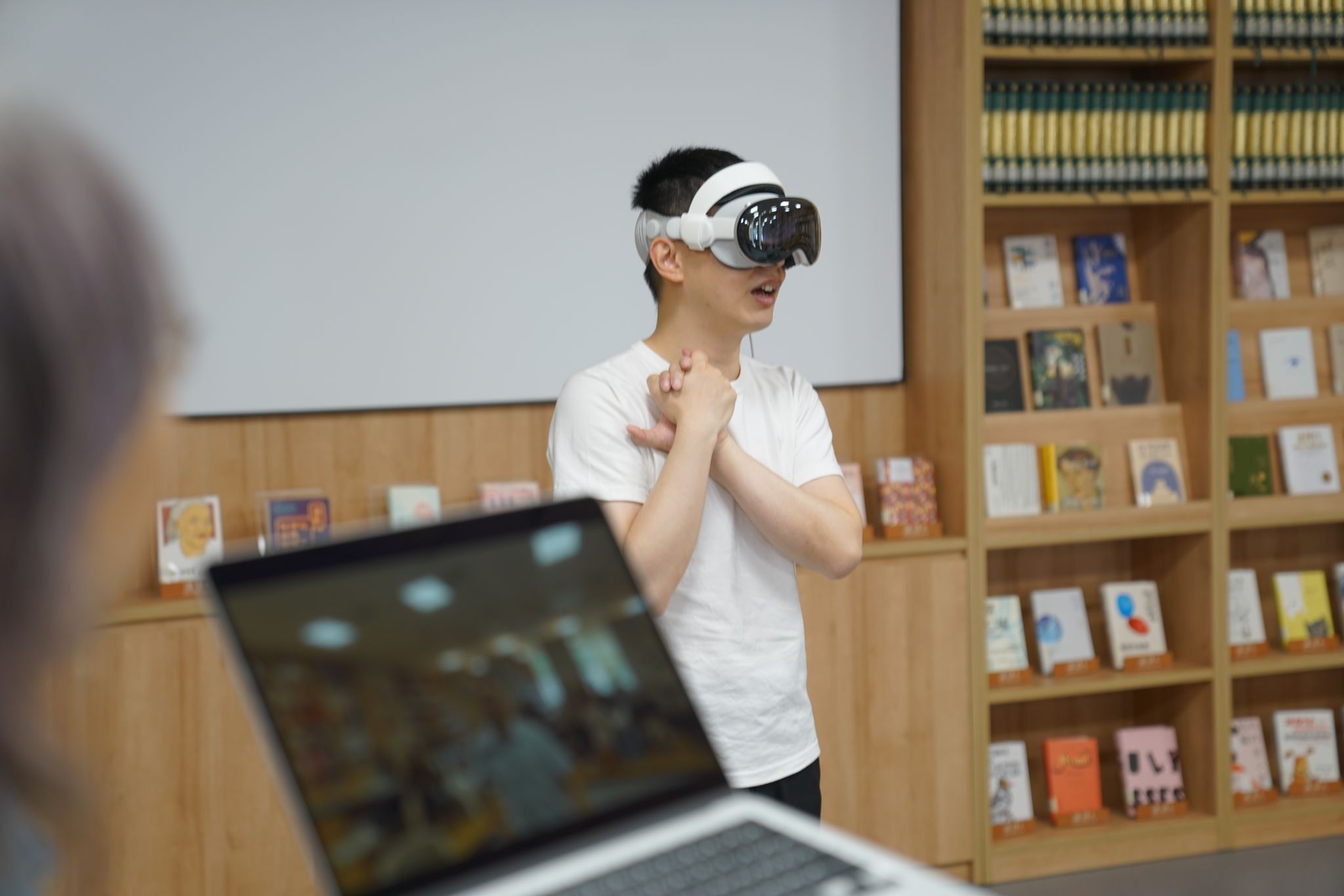 活动的下半场,唐义苏老师带来了备受期待的“基于 Apple Vision Pro 的空间计算 XR 分享”。他详细介绍了Apple Vision Pro的最新技术进展、空间计算的原理及其在未来教育、娱乐、工作等领域的广阔应用前景。理论分享结束后,活动特别设置了Apple Vision Pro的亲身体验环节。两名幸运的参与者获得了率先体验的机会,他们沉浸在虚拟与现实交织的奇妙世界中,感受到了前所未有的视听震撼与交互体验。体验结束后,参与者们均表示感受“非常好”,对未来科技带来的无限可能充满了期待。