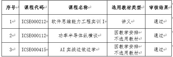 依据《太阳成集团tyc7111cc教材管理实施细则》(西交党〔2024〕35号)相关教材选用规定,根据公司教务处《关于开展2024-2025学年第二学期本科教材选用和征订工作的通知》要求,公司教材建设工作组已完成公司2024-2025学年第二学期开课课程的教材选用审核工作,现将审核结果公示如下: